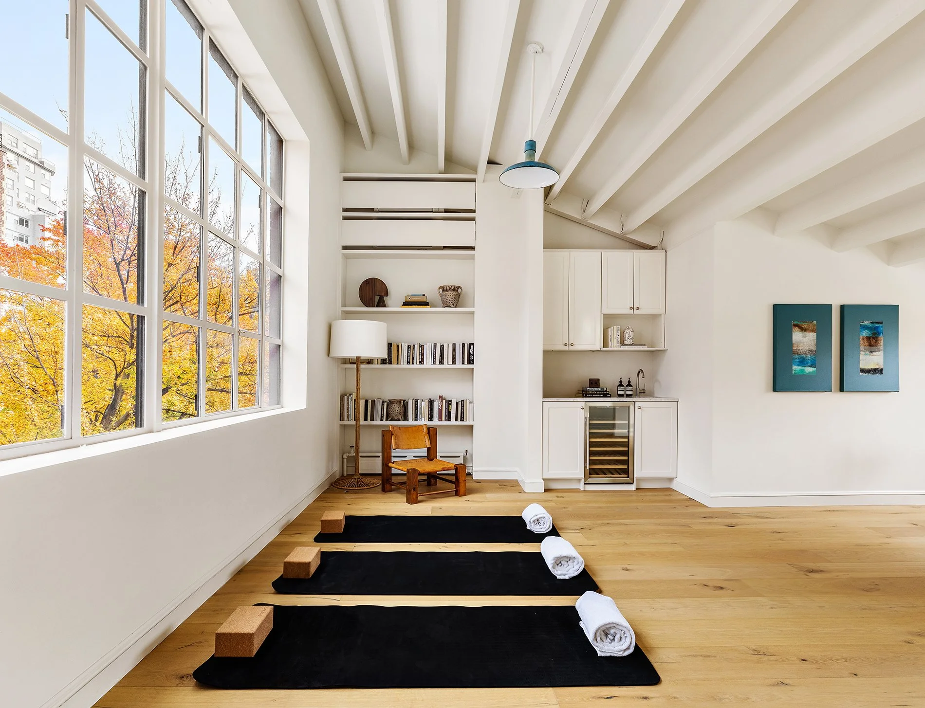 Sky-high retreat, the pinnacle of the home is a dramatic space defined by beamed ceilings exceeding 13-ft and lovely casement windows. It features a wet bar with a wine fridge, a full bathroom, and access to the sun-drenched south-facing terrace. This top-level outdoor space offers iconic views across the Village, sweeping from the Jefferson Market Library to the distant Freedom Tower, perfect for indoor/outdoor entertaining, made easy by elevator access.